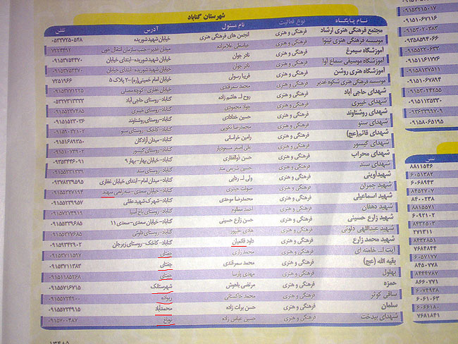 در قسمت کانون فرهنگی هنری شهید چمران به جای آدرس “گناباد – خ سعدی – سراهی مند” . “گناباد – خ سعدی – سراهی سهند” تایپ شده است.