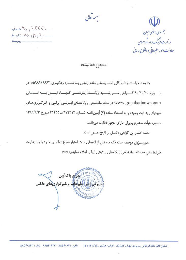 دریافت مجوز رسمی وزارت ارشاد توسط گنابادنیوز