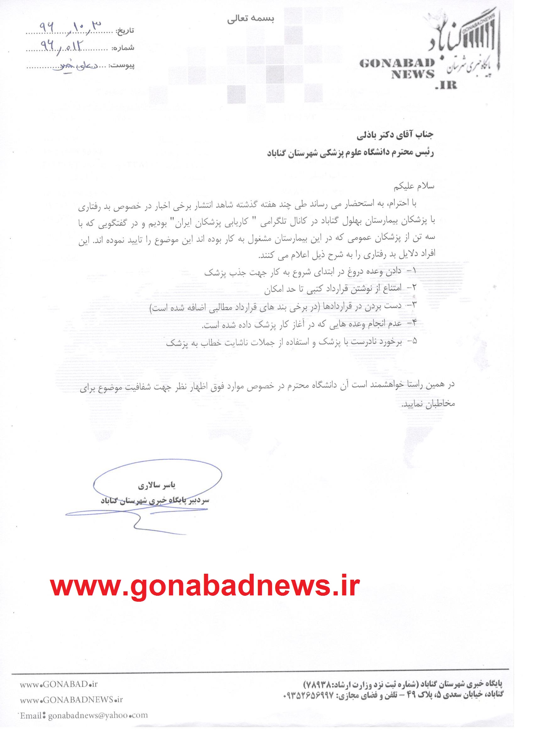 در مورد بند ۵ پیشنهاد می شود یک نظرسنجی از پزشکان شاغل در بیمارستان که از گذشته و حال مشغول خدمت بوده و هستند انجام گردد تا واقعیت مشخص شود. گواه بر حسن برخورد مسئولین بیمارستان و دانشگاه با پزشکان و رضایت پزشکان این است که علی رغم تاخیر در پرداخت به پزشکان محترم پزشکان محترم رشته های چشم، زنان و زایمان ، داخلی و اطفال علی رغم اتمام مدت طرحشان با رضایت و درخواست خود به همکاری با بیمارستان ادامه دادند که لازم می دانیم از لطف این عزیزان و دیگر پزشکان خدومی که صادقانه و بی منت به مردم شهرستان های گناباد و بجستان ارائه خدمت می نمایند، سپاسگزاری نماییم.