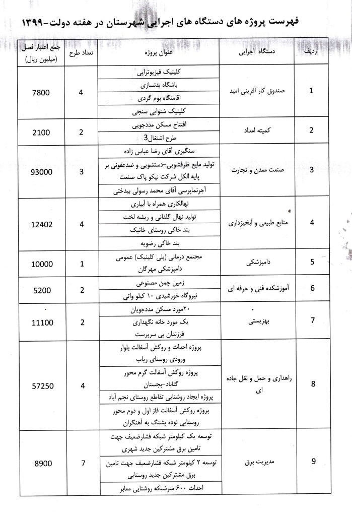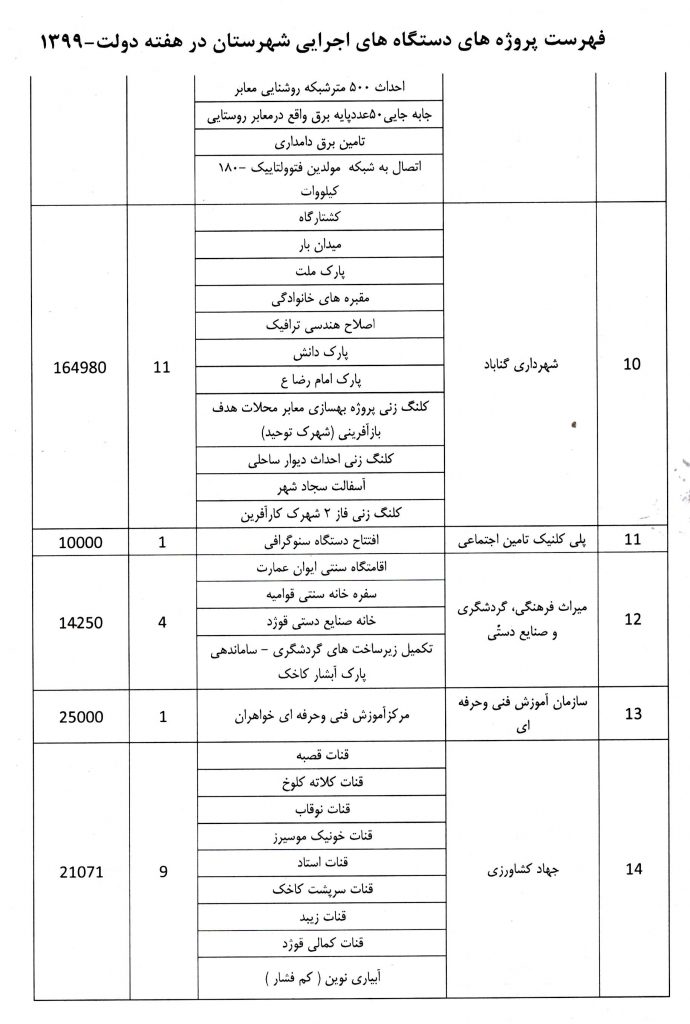 همزمان با هفته دولت در شهرستان گناباد تعداد۷۸ طرح با اعتباری ۵۰ میلیارد تومانی به بهره برداری رسید که در زیر شاهد لیست طرح های دستگاه ها با اعتبار آن هستید