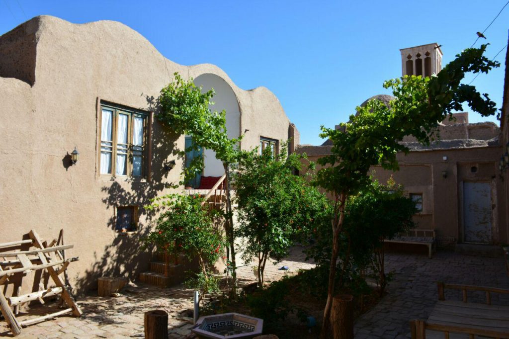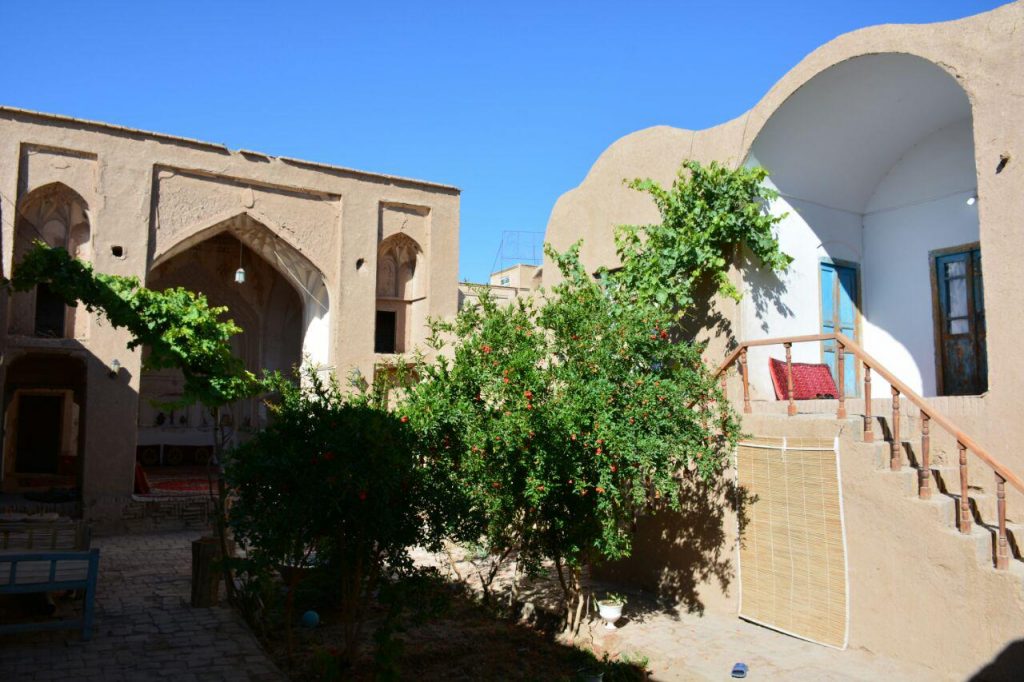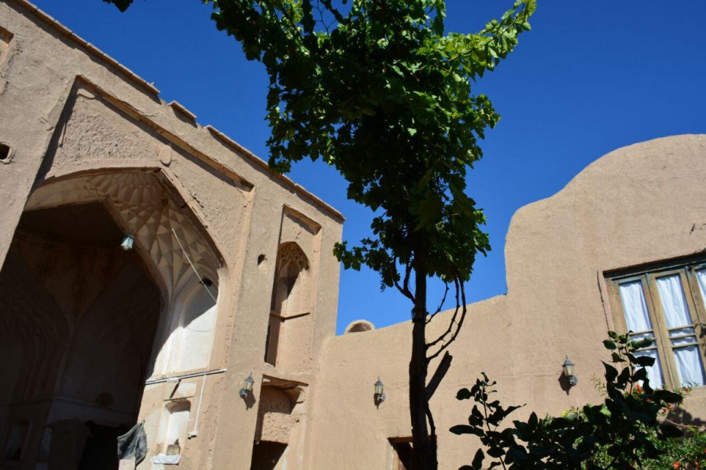 شناسایی ادامه داد: حیاط مستطیلی و خشت فرش است با ازاره‌ای دور تا دور حیاط و آجر کاری خفته راسته و باغچه‌ای در وسط. ایوان در ضلع جنوبی بنا قرار دارد . ایوان مرتفع با دو دالان در اطراف و دو ایوانچه بر روی دالانها و داخل ایوان چلیپایی همراه با تزئینات گچبری فراوان که چشم هر گردشگری را خیره می‌کند. گنبد پشت ایوان در زلزله سال ۱۳۴۷ تخریب و اکنون به صورت تخت پوشیده شده است.