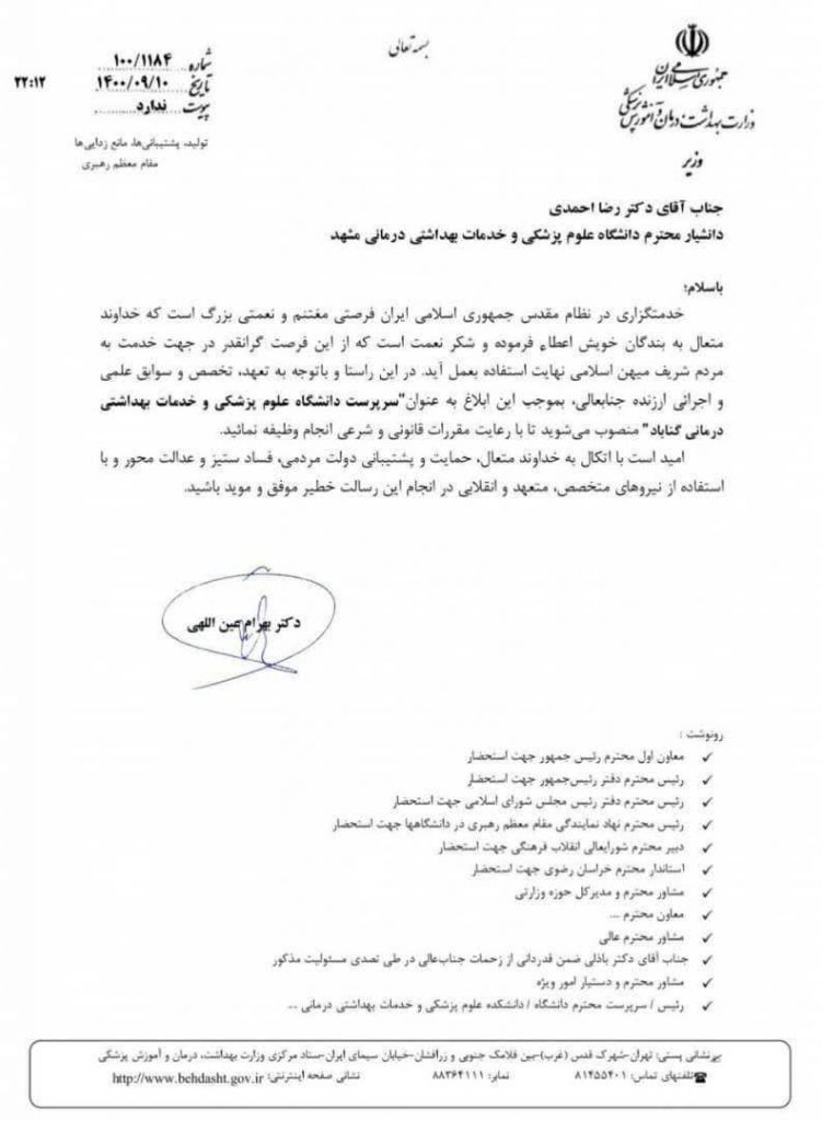 وزیر بهداشت درمان و آموزش پزشکی طی حکمی رضا احمدی را به عنوان سرپرست دانشگاه علوم پزشکی گناباد معرفی کرد.